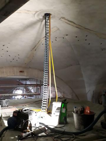 - Beispiel Vierung: Auch wenn die Stiftskirche auf dem höchsten Platz im Tal zwischen den alten Auebachläufen errichtet wurde, der Boden ist stets feucht und in Bewegung. Das Gewicht der Vierungskuppel hat die Pfeiler auseinandergedrückt. Es bestand akute Einsturzgefahr für das Kirchenschiff. Nach einer notdürftigen Abstützung der Vierung durch ein Gerüst entschied man sich für eine dreifache Sicherung: Haken zischen den Pfeilern, Betonierung der Kuppel mit einem besonders leichten Beton und Aufhängung der Kuppel an einem unter dem Dachstuhl befindlichen Gerüst.