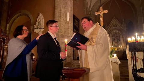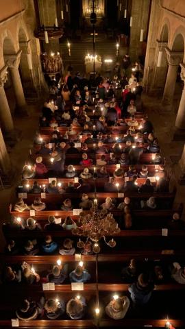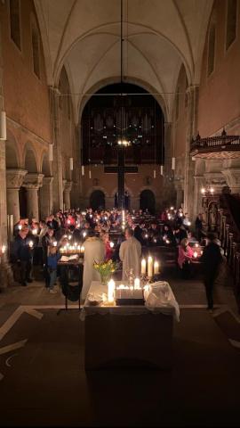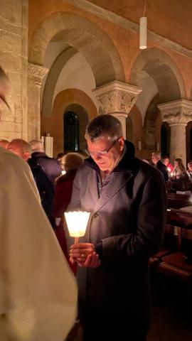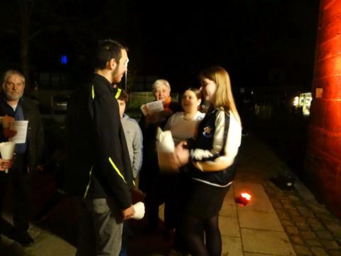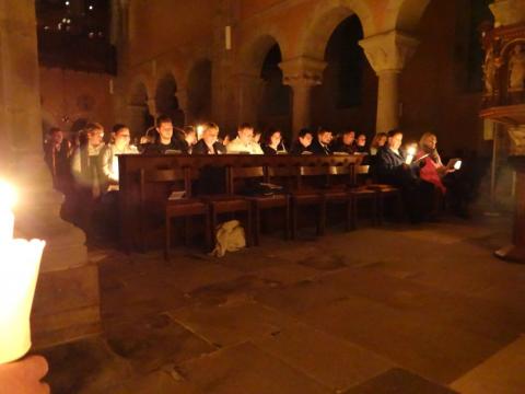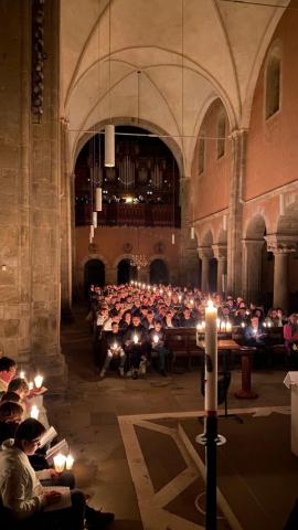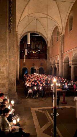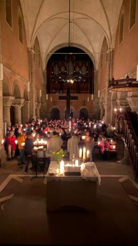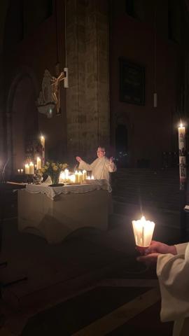 Vor und in der voll besetzten Stiftskirche haben Gemeindeglieder aus St. Bonifatius und der Stifts-Kirchengemeinde gemeinsam die Auferstehung Jesu gefeiert. Nach dem Auftakt am Osterfeuer vor der Kirche erfolgte der gemeinsame Einzug. Als alle sicher ihren Platz gefunden hatten, wurde das elektrische Licht gelöscht. Mit dem feierlichen Einzug der von Mütter- bzw. Familienkries für die jeweils andere Gemeinde geschmückten Osterkerzen zog dann das neue Licht in die alte Kirche ein. In einer Lichterfeier verteilten die PfadfinderInnen das Licht der Osterkerze an die Kerzen der Besucher. Mit Steven Schulz und Sophie Sill wurden am Taufbecken zwei junge Menschen in die katholische bzw. evangelische Gemeinde aufgenommen. Eine Besucherin dazu: "Es ist toll! Ihr hebt das Verbindende der Konfessionen hervor!" In der Predigt machte sich Pfarrer Andreas Körner auf die Suche nach den fröhlichen Ostergesichten im Kirchenschiff. Die Auferstehung geht uns auch heute an und schenkt Grund zur Freude. Das unterstützte auch Pastor Volker Milkowski, der nach dem Abendmahl einige Osterwitze erzählte.