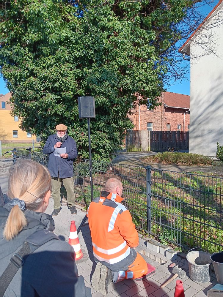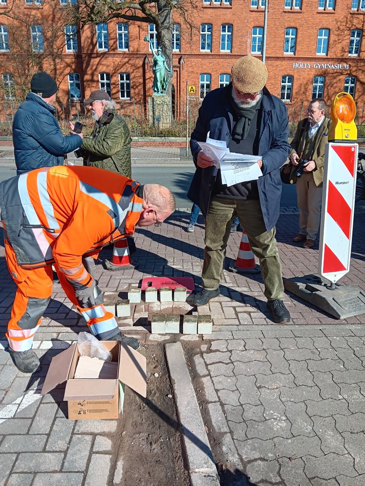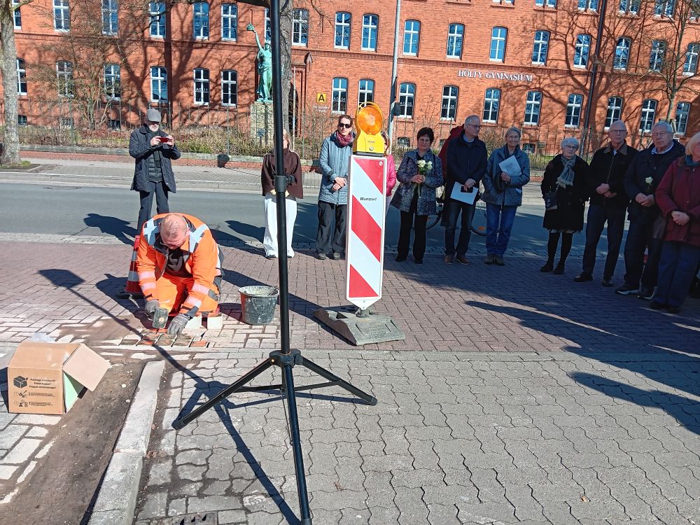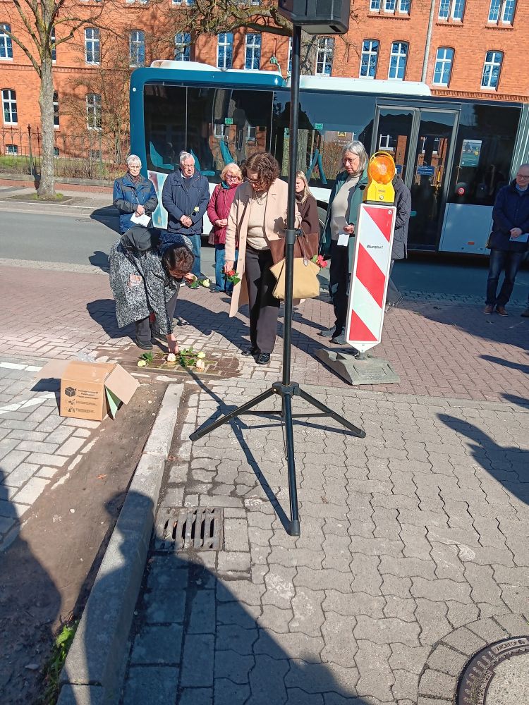Unter großer Anteilnahme hat der Arbeitskreis Erinnerung am 18. März weiter 20 Stolpersteine in Wunstorf verlegt. Sie erinnern an MitbürgerInnen, die in der Zeit des Nationalsozialismus aus Wunstorf verschleppt und ermordet wurden. Besondere Beachtung fanden dabei die Vorträge der Urenkelin von Emil und Elfriede Kraft, Behrstock und ihrer Tochter, die extra aus New York angereist waren, sowie von Frau Roth, die den letzten Brief ihres Großvaters aus dem KZ an die Familie verlas. Eine ehemalige Nachbarin überreichte dem Arbeitskreis ein Poesiealbum von Röschen Spanier, das sich bei Aufräumarbeiten im Keller angefunden hatte. Für den November ist eine weitere Verlegung geplant.