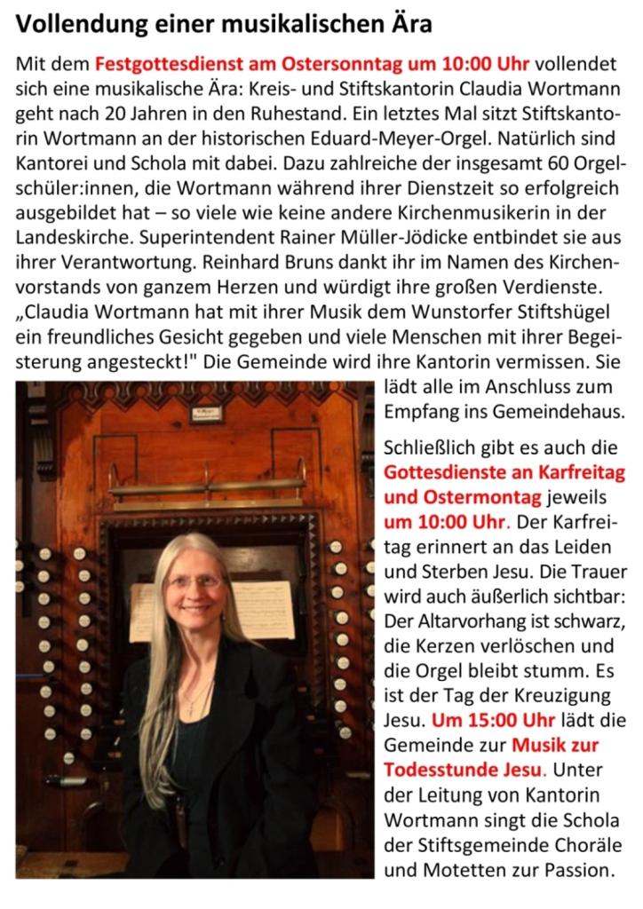 Von Stade und Ostfriesland, über die USA und Indien nach Wunstorf: Claudia Wortmann ist weit herumgekommen in fast 50 Berufsjahren. Und sie hat überall die Zuhörer mit der faszinierenden Vielfalt der Orgelmusik und mit ihrem klaren Gesang begeistert. Große Konzerte, aber auch Schola und Kantorei der Stifts-Kirchengemeinde haben mit der "Alten Musik" unter ihrer Leitung vor Ort und überregional Beachtung und Anerkennung gefunden. Sie hat die Kirchenmusik in der Stifts-Kirchengemeinde viele Jahre hindurch geprägt und akzentuiert. 42 OrgelschülerInnen hat Claudia Wortmann während ihrer Dienstzeit allein in unserem Kirchenkreis unterrichtet (60 waren es insgesamt) und sie sachkundig an die Besonderheiten der Orgeln im Kirchenkreis herangeführt und so den musikalischen Nachwuchs für die Gottesdienstbegleitung gesichert. Nun endet zum 01.Mai 2026 für die Stifts- und Kirchenkreiskantorin ein engagiertes, von außergewöhnlicher Musik geprägtes Berufsleben.