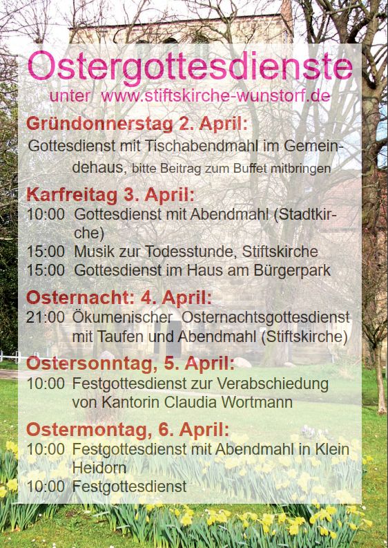 Anmeldungen bitte zu Bürozeiten (Di+Fr 09:30-12:00 Uhr) an das Gemeindebüro unter Tel. 3484 oder Email buero@stiftskirche-wunstorf.de oder am einfachsten über das Online-Formular.